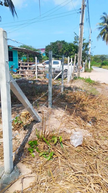 เสารั้วอัดแรง 3" x 3" x 2.50 เมตร ฝังดิน 50 ซม. ระยะห่างระหว่างเสา 2.50-3.00 เมตร ขึงลวดหนามจำนวน 5 เส้น