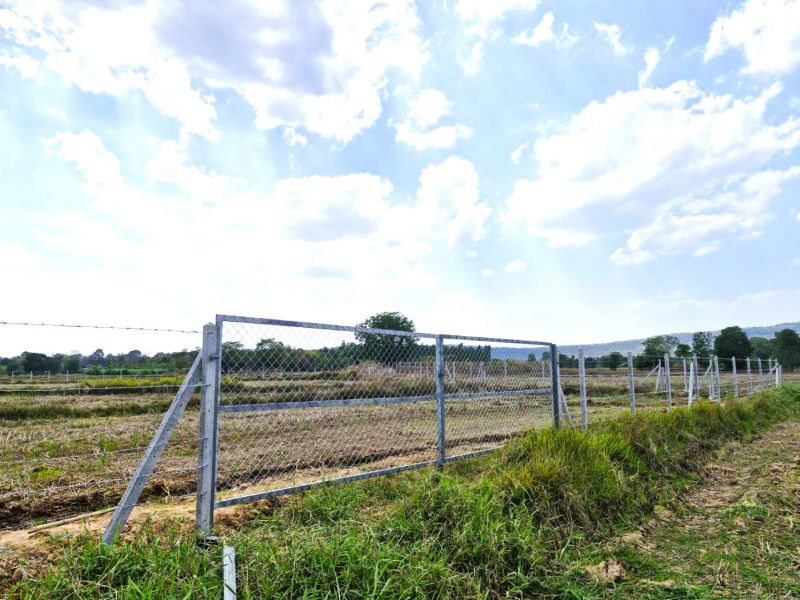 เสาเหล็กแป๊ปน้ำ 1 1/2" x ยาว 2.50 เมตร ฝังดิน 50 ซม. ระยะห่างระหว่างเสา 3.00 เมตร ขึงด้วยตาข่ายไวน์แมนสูง 2.00 เมตร