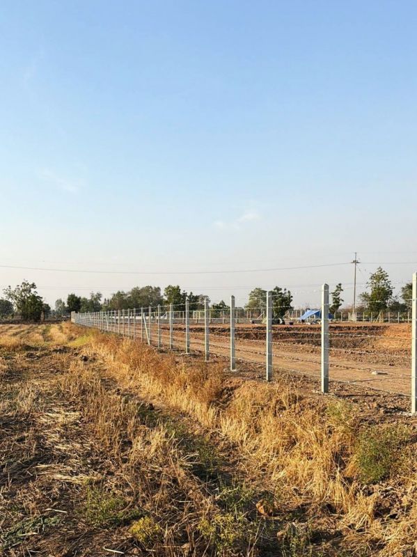 เสารั้วอัดแรง 3" x 3" x 2.50 เมตร ฝังดิน 50 ซม. ระยะห่างระหว่างเสา 2.50-3.00 เมตร ขึงลวดหนามจำนวน 7 เส้น